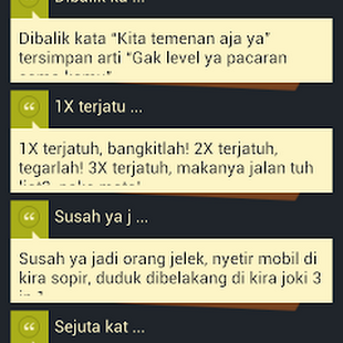 Apakah Anda bingung dari sebelumnya ketika saya ingin menulis status update di Facebook, atau saat akan tweet di Twitter? Nah, kata-kata aplikasi lucu akan membantu Anda menulis status di Facebook, Twitter atau BBM bajingan. Aplikasi ini berisi kumpulan kata-kata lucu yang bisa membuat Anda atau teman Anda tersenyum ketika mereka membaca sendiri, hehe.